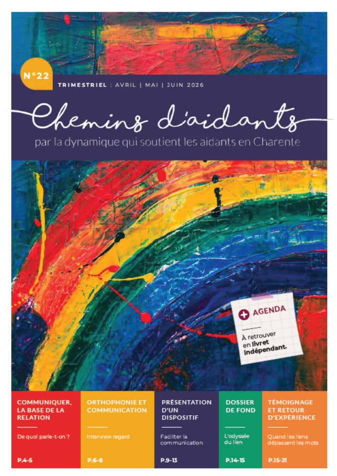 Chemins d’Aidants n°22, le journal écrit par des aidants pour des aidants en Charente, consacre ce nouveau numéro à un thème central : la communication dans la relation, en particulier entre aidant et aidé. On y retrouve un éditorial sur le dialogue, un dossier « La communication, la base de la relation entre les êtres vivants », des éclairages sur la communication dans la relation aidant‑aidé et au sein de la famille, ainsi qu’une interview d’orthophoniste pour explorer toutes les modalités de communication possibles.